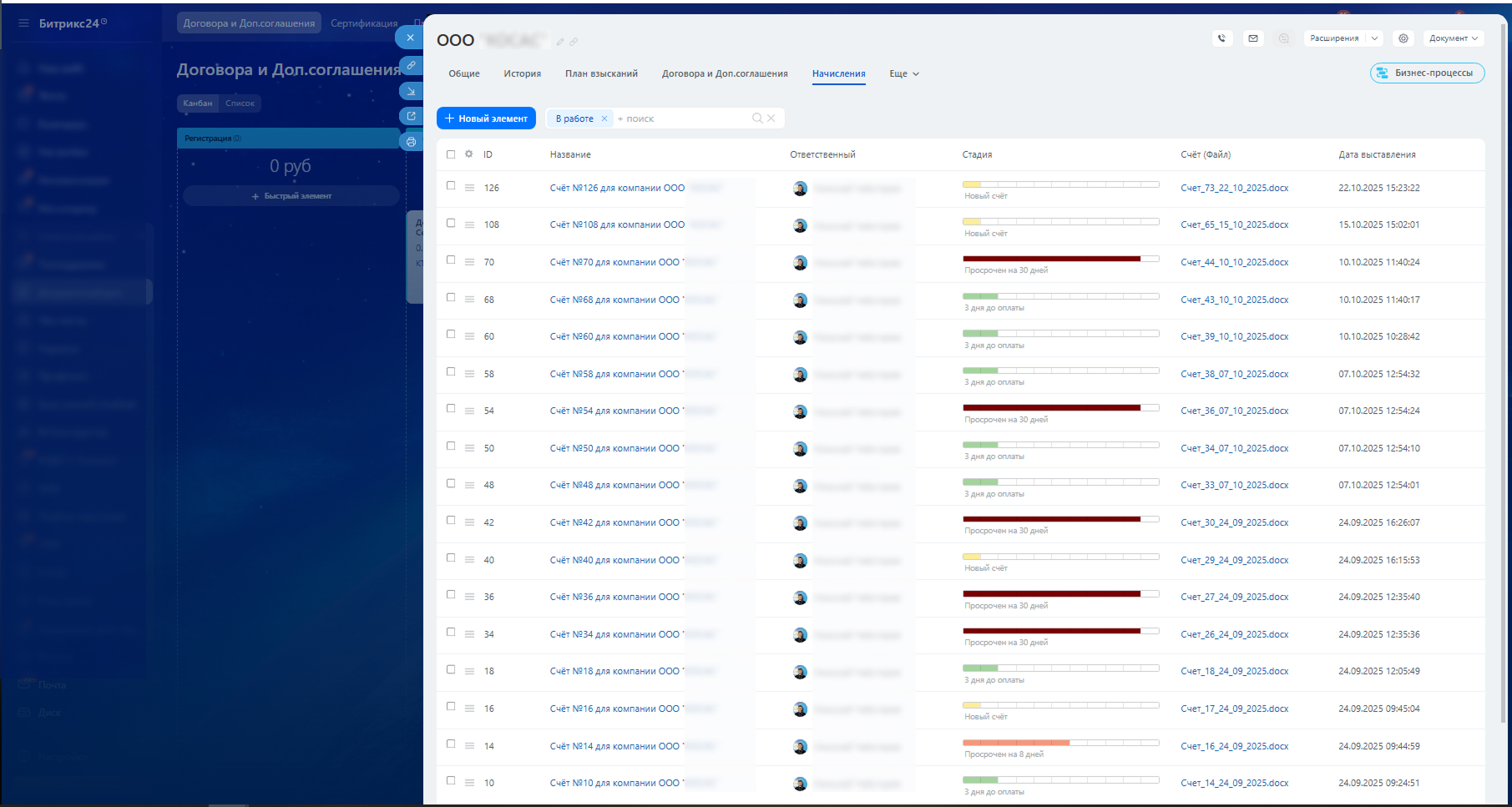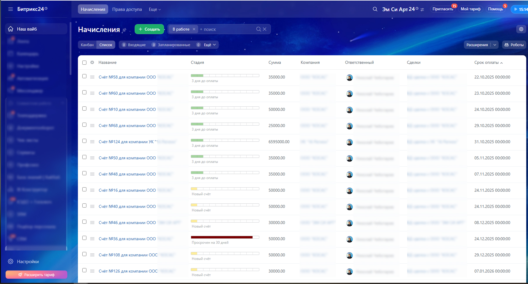 Воронка начислений. Сквозной просмотр всех счетов в разрезе их статусов — какие в работе, какие оплачены, а какие просрочены.